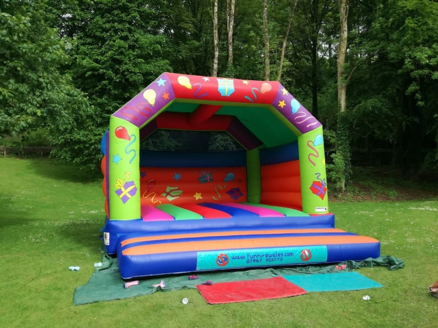 Is generous sized castle is very popular for a wedding parties as it can comfortably hold around 12 to 14 adults safety information can be seen on the side of the Castle. Then when it comes to kids parties or events there is lots of room for everyone. With it's built-in and sunshade it's brilliant for all weathers and can also be put inside if you can find a big enough Hall.