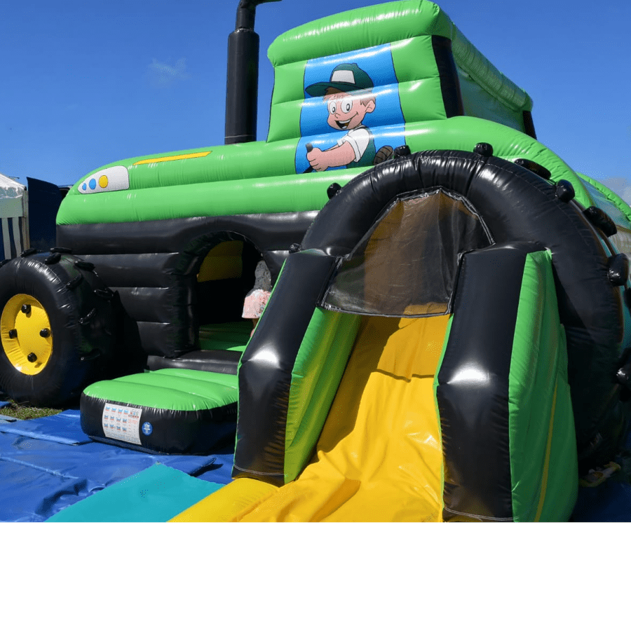 Our tractor-themed bouncy castle with a built-in slide is the perfect attraction for farm-loving kids and a hit at any outdoor event! This vibrant inflatable is designed to resemble a playful tractor, complete with large, inflatable wheels, bright green and yellow colors, and farm-inspired details that will captivate children’s imaginations.
