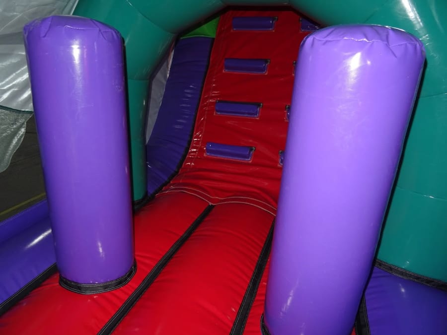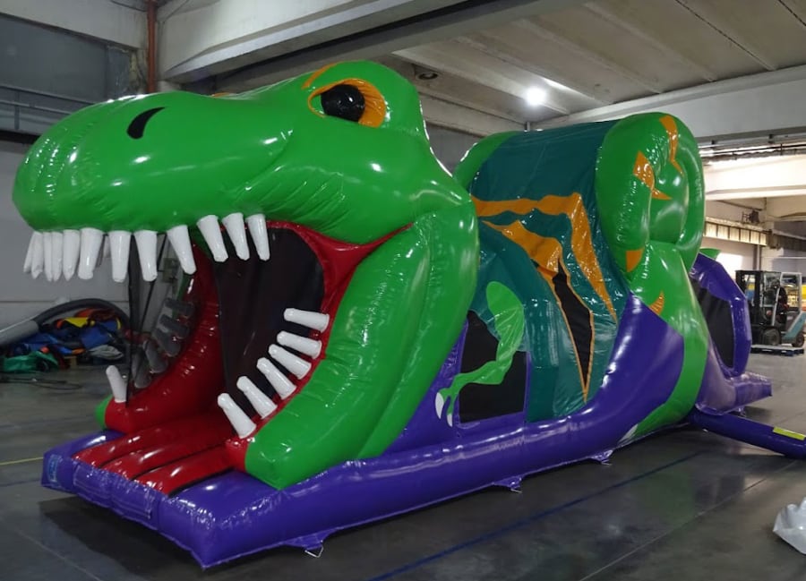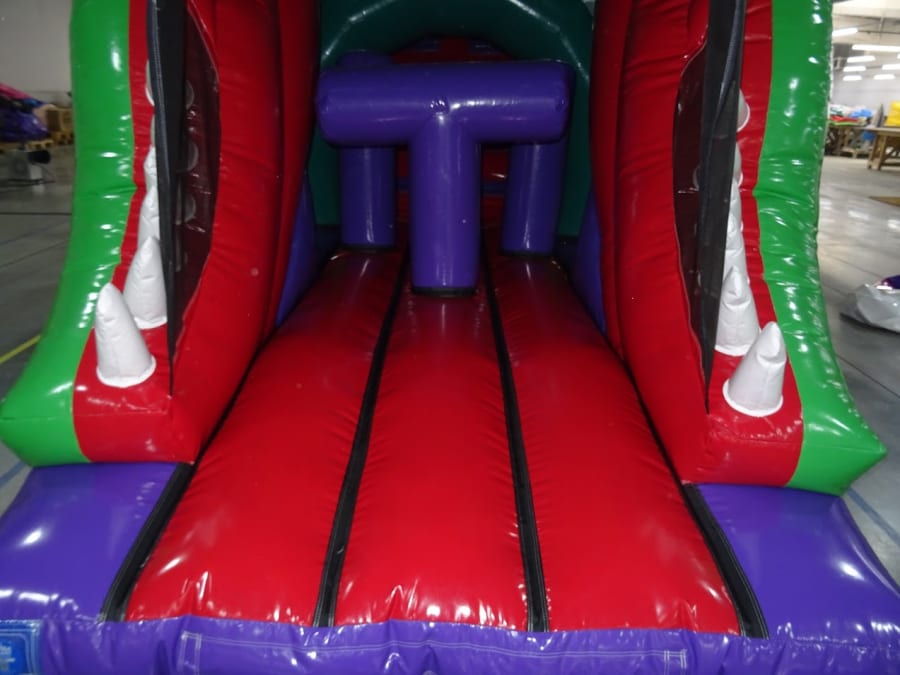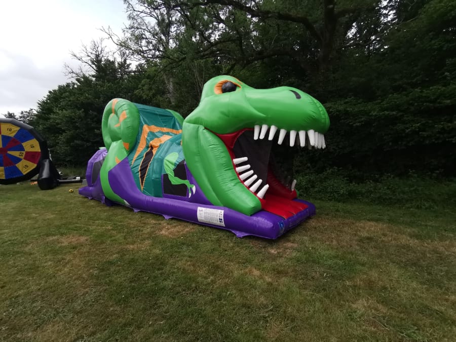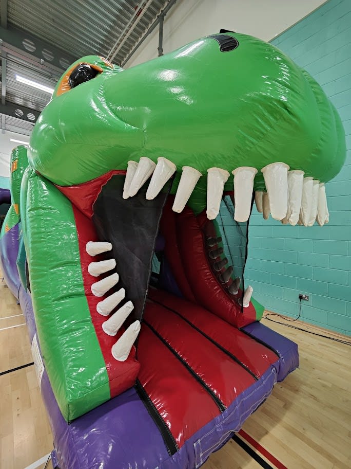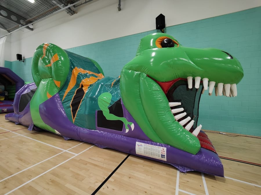 Our amazing dinosaur assault course will keep children amused for hours thanks to its eye catching features a biff bash, obstacles and has slide that come out the mouth of the dinosaur next to the teeth..