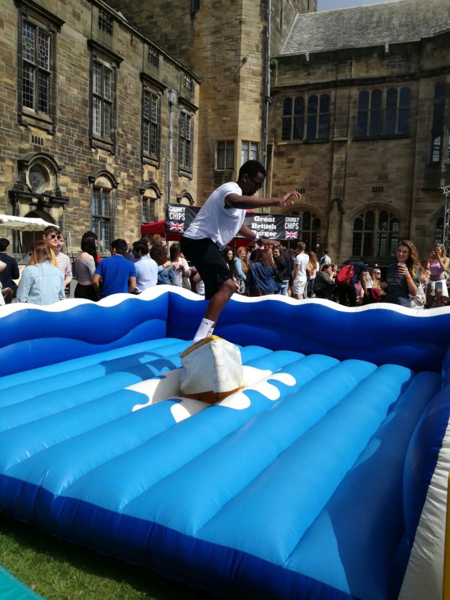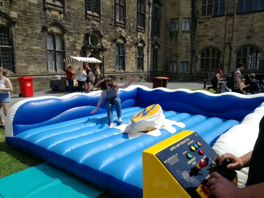 Have a go at our fantastic Simulated Surfboard, a must have addition to any event, party or fun day. Our incredible Simulated Surfboard always proves a hit, especially summer barbecues and beach parties. This ride replicates the motions of a real-life surfboard, giving a realistic surfing experience to riders of all ages. The surfer must remain balanced for as long as possible before loosing balance and falling into the ocean waves! Don't worry, there is an inflatable base surrounding the skateboard for the riders safety and soft landing!